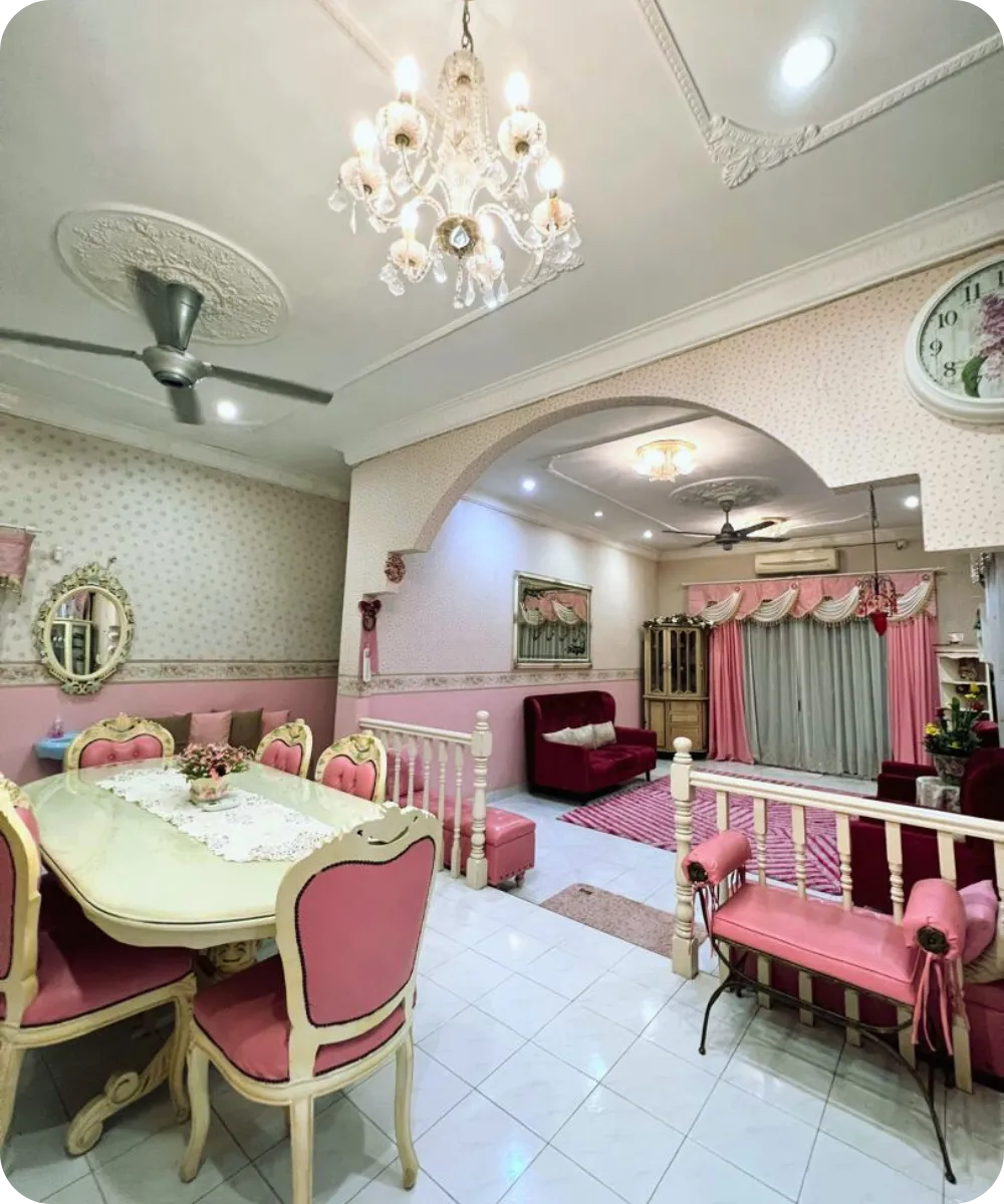 Mempunyai dua ruang tamu yang luas sesuai untuk berkumpul beramai-ramai. Meja makan utama di antara dua ruang tamu. Meja makan di dapur turut tersedia.